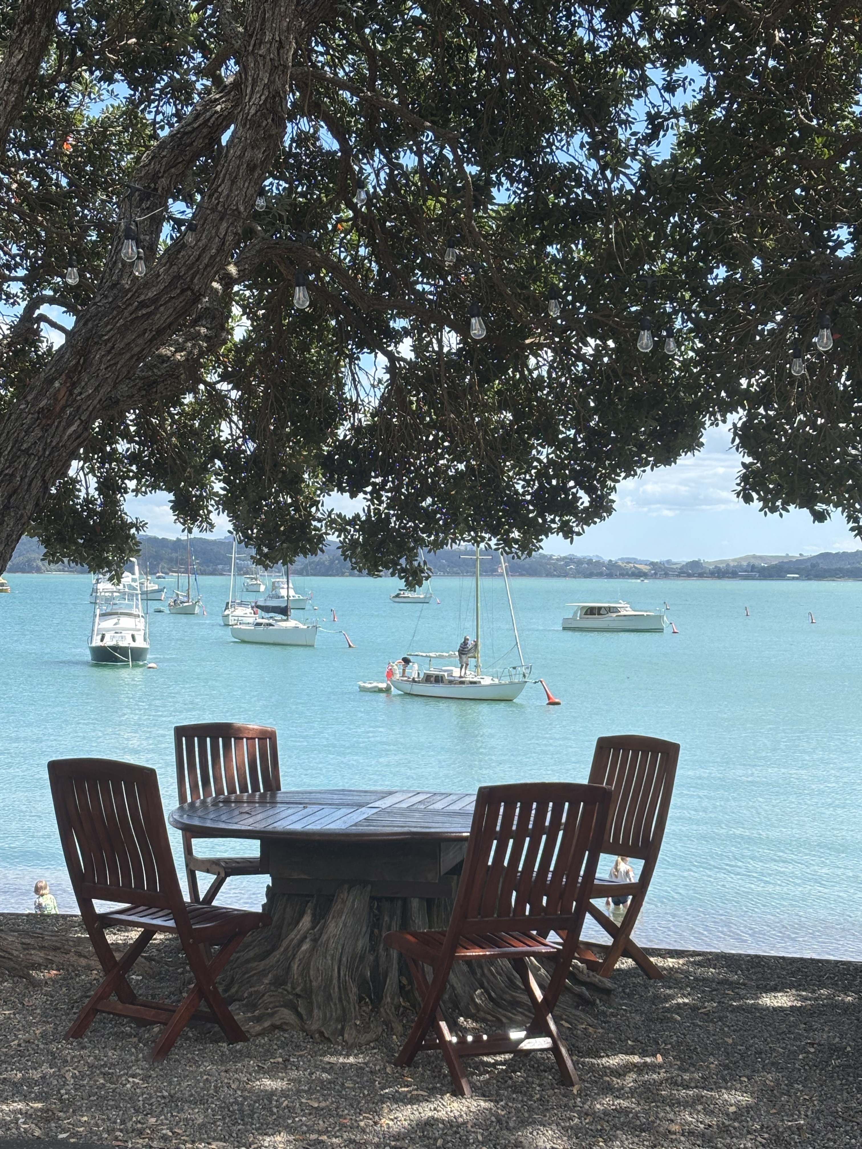 It was after noon when we arrived, so we immediately headed to The Gables restaurant for lunch, which was a few buildings to our right along the beach. This restaurant came recommended to us and happened to be the oldest restaurant in New Zealand! It was opened in 1847, and the original foundation was built using whale bones as Russell was a big whaling town. It wasn’t busy and we got a table right in the open front window overlooking the beach. We had a wonderful leisurely lunch with a seafood appetizer, freshly caught red snapper (little did we know then that we would meet this fish again – future blog hint), salad and one of the best chocolate desserts we have ever had. And of course, we enjoyed some local New Zealand wine while soaking in the incredible views of the waterfront, we couldn’t stop taking pictures! What a delightful time, it was hard to leave this amazing spot.